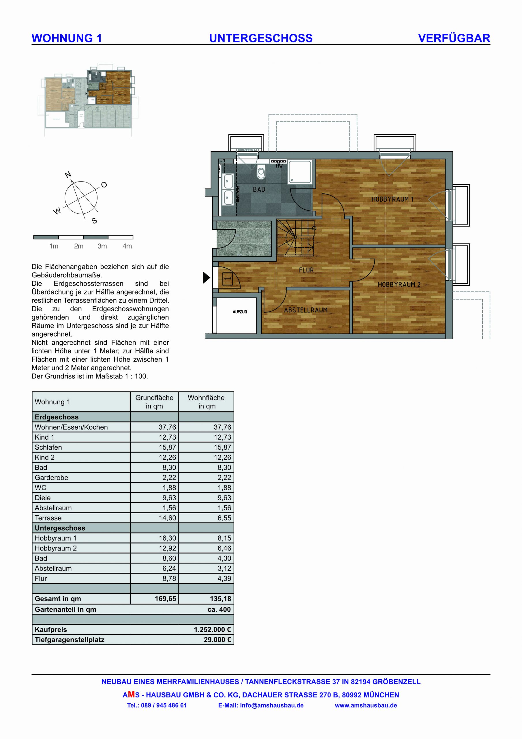Zwei der Wohnungen im Erdgeschoss haben zusätzlich vollständig ausgebaute Hobbyräume mit separatem Abstellraum und Duschbad im Untergeschoss. Eine interne Treppe verbindet das Erd- und Untergeschoss dieser Wohnungen miteinander.